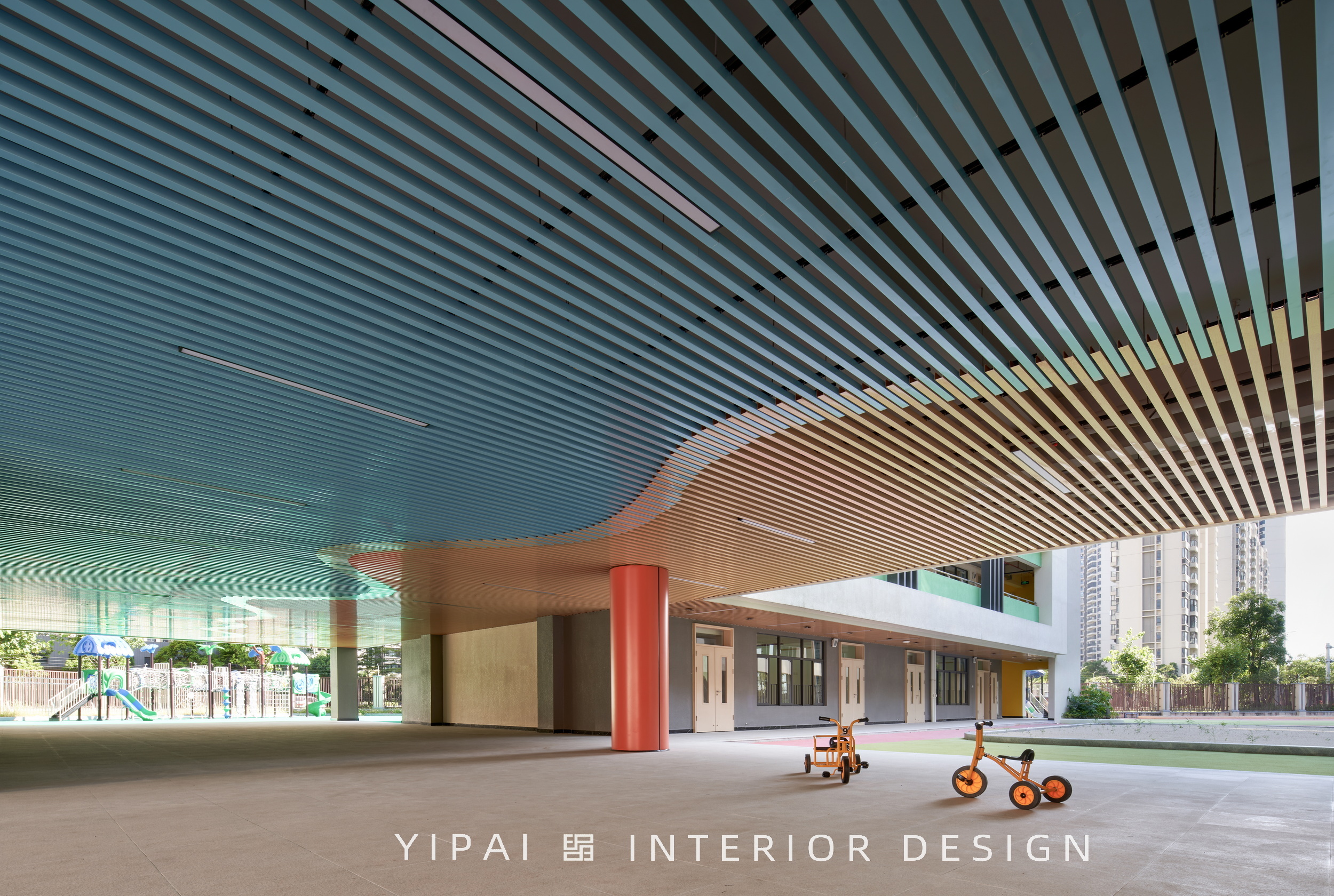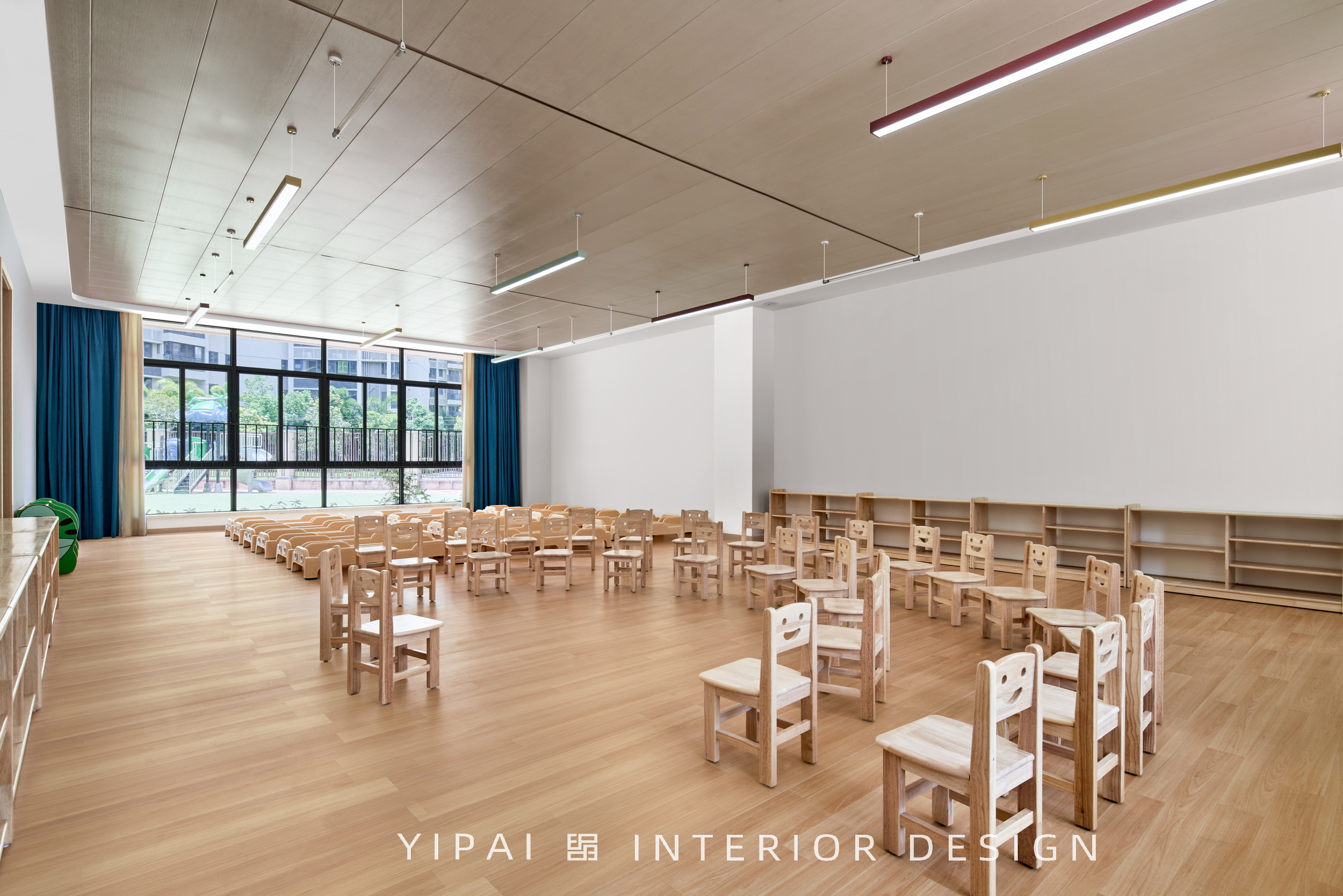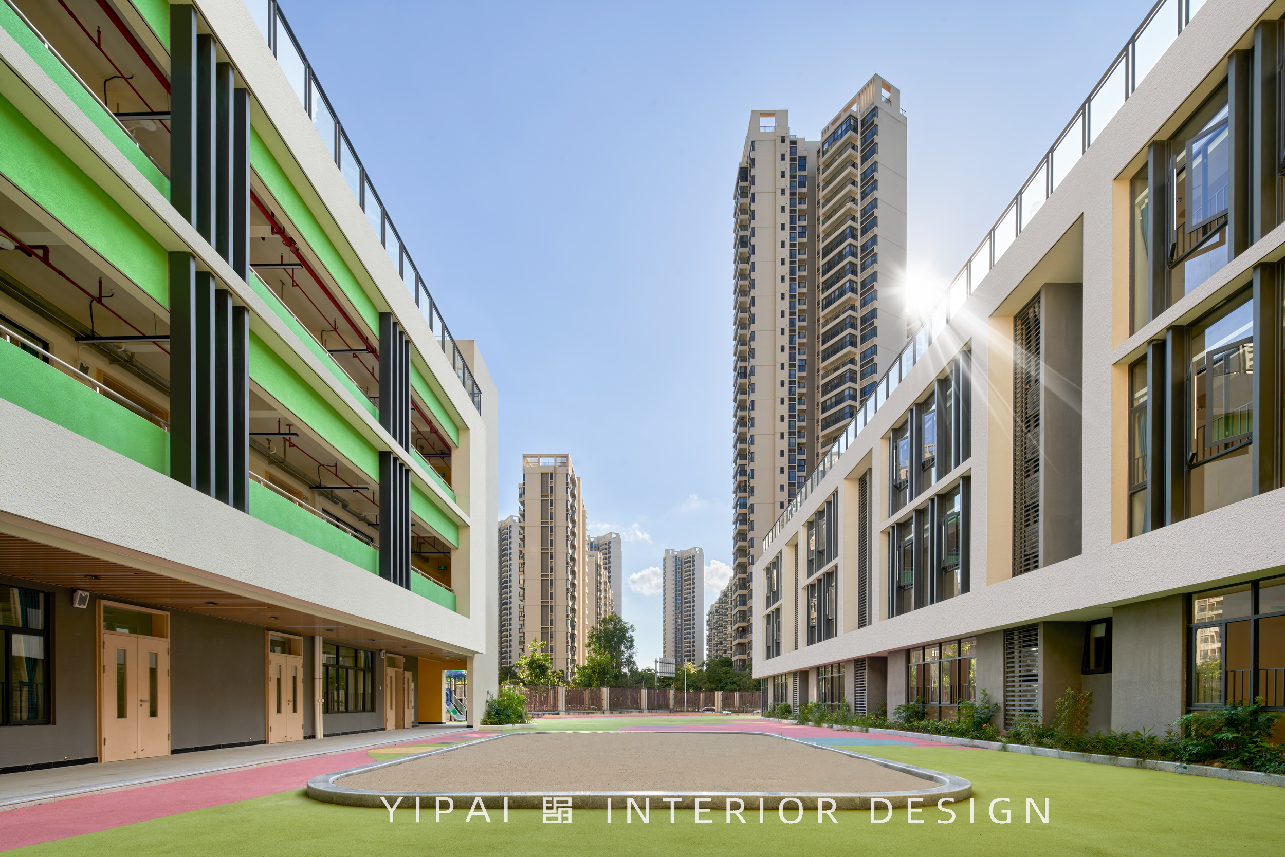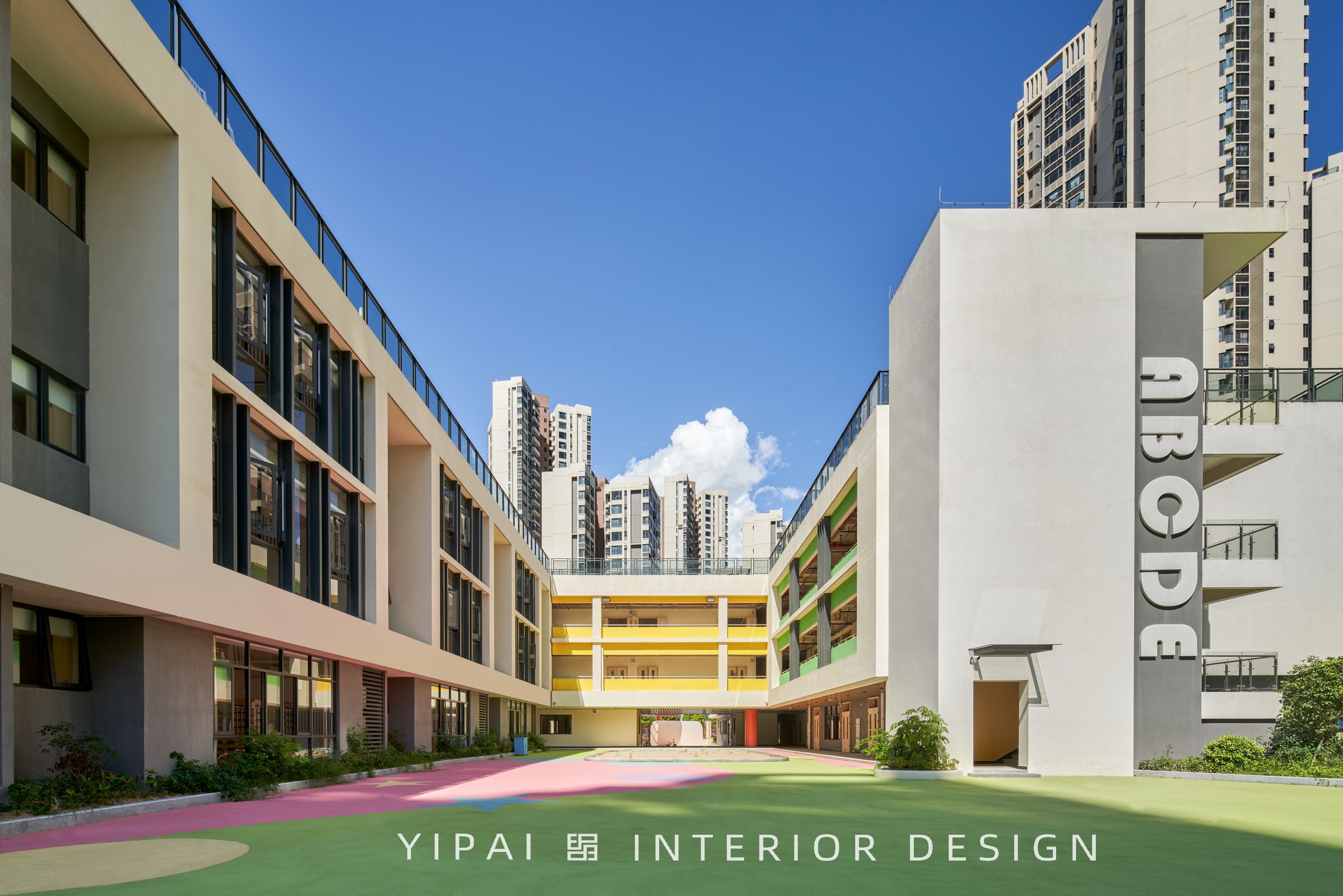 項(xiàng)目位于珠海斗門區(qū),廣東省珠海市斗門區(qū)新青五路南碧水岸西南側(cè),是自帶“貴族”氣息的幼兒園,園區(qū)室內(nèi)外的總面積超10000平方米;設(shè)計(jì)需滿足日照標(biāo)準(zhǔn)的幼兒園功能及室外活動場地,因此將幼兒活動單元及活動場地布置在建筑周圍,讓小朋友可以在天氣晴朗的時候,在陽光下恣意奔跑玩耍。